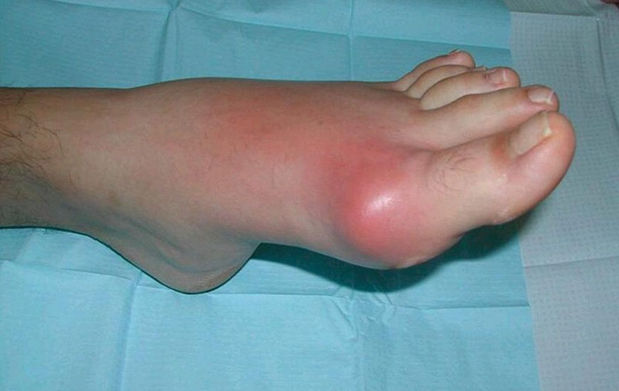 El ataque agudo de gota suele comenzar por la noche y consiste en una artritis que causa intenso dolor y enrojecimiento en la articulación metatarsofalángica del dedo gordo del pie.